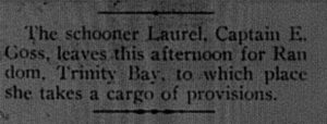 The schooner Laurel, Capt. E. Goss, leaves this afternoon for Random, Trinity Bay, to which place she takes a cargo of provisions.