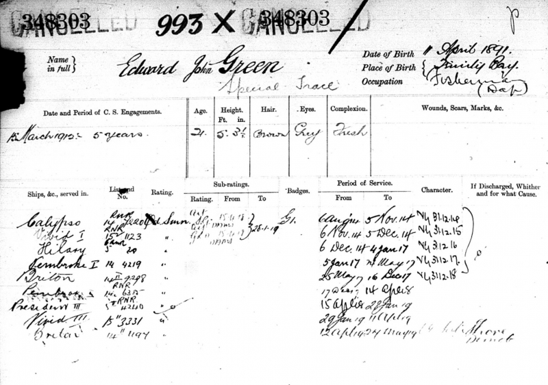 Son of Charles and Rachel (Whalen) Green Birthplace: St. Jones Without Birth Date: April 11, 1891 Enlistment Date: March 15, 1912 Demobilization: May 24, 1919 |