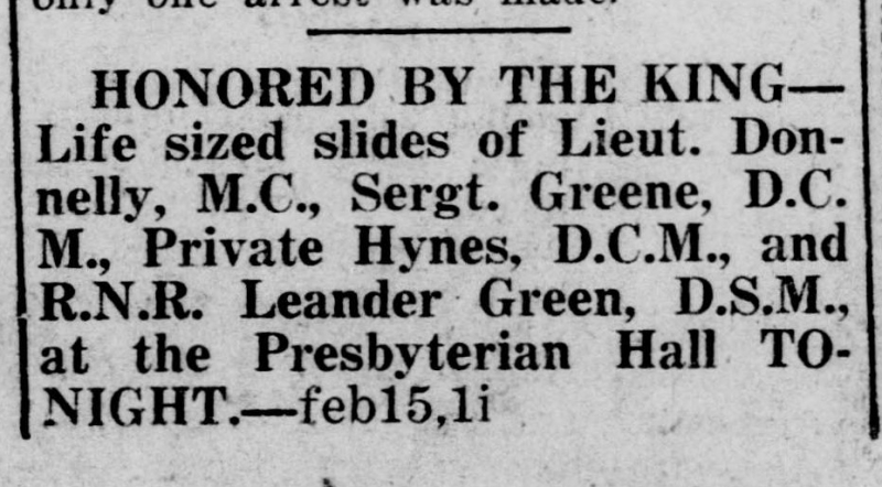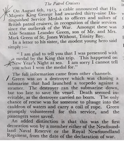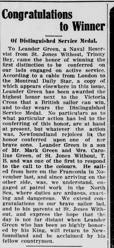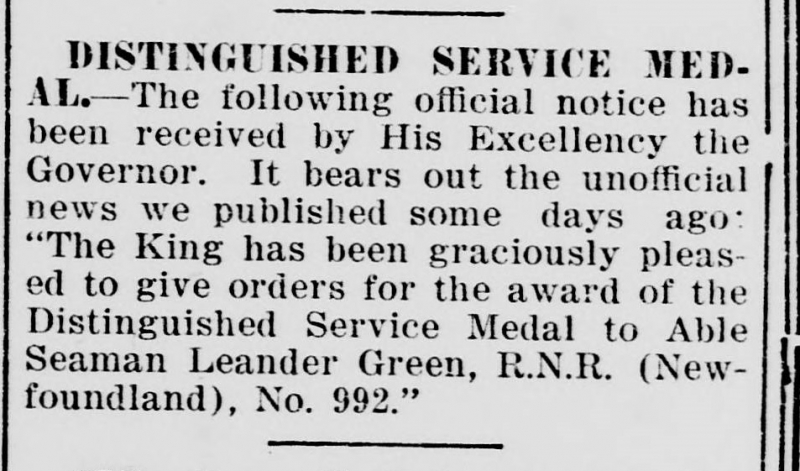 • Leander Green was the first Newfoundlander to be awarded distinguished service medal for bravery in First World War, The Packet 2018