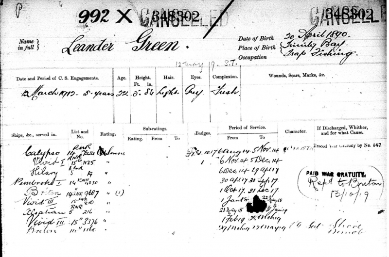 You are here: Home / Military / WWI, Records and Photos / Newfoundland Royal Naval Reserve, WW1 / Sailors of the Newfoundland Royal Naval Reserve, WW I / Leander Green, 992X