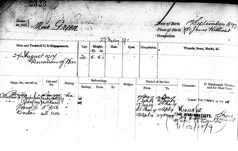 Son of Samuel and Lydia (Seward) Green Birthplace: St. Jones Without Birth Date: September 22, 1897 Enlistment Date: August 27, 1917 Demobilization:May 27, 1919 |
