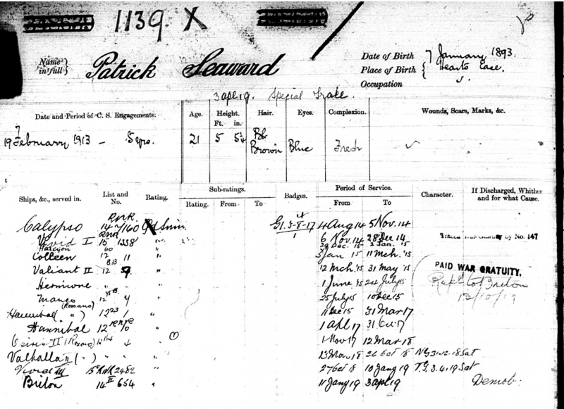 Son of Patrick and Lavinia (Pitcher) Seaward Birthplace: Gooseberry Cove Birth Date: June 7, 1893 Enlistment Date: February 19, 1913 Demobilization: April 3, 1919 |