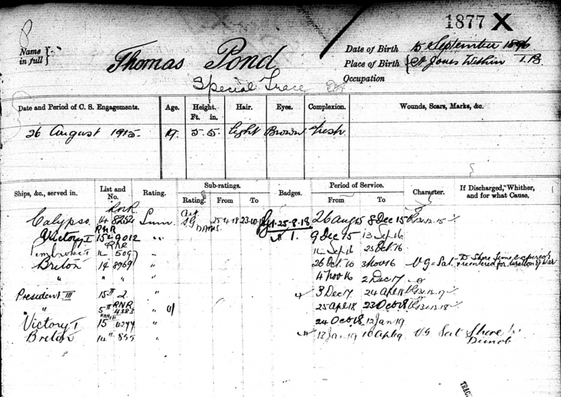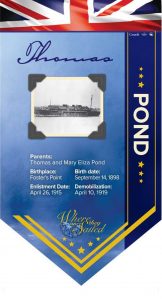 Son of Thomas and Mary Eliza (Benson) Pond Birthplace: Foster’s Point Birth Date: September 14, 1898 Enlistment Date: April 26, 1915 Demobilization: April 10, 1919 |