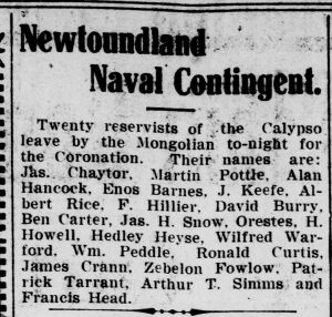 James enlisted in March of 1908 and served seven years before the war, completing a total 228 days of naval training at the HMS Calypso. An article entitled “Newfoundland Naval Contingent” appeared in the Evening Telegram on June 3, 1911 confirms that James travelled overseas on the SS Mongolian with a contingent of 20 Royal Naval Reservist to attend the coronation of King George V. Also, among the sailors was William Peddle of Hodge’s Cove.
