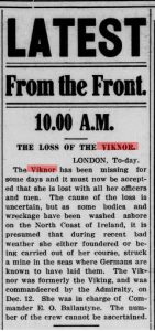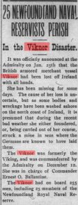 Thirteen days after the sinking the Evening Telegram reported the news about this tragedy. The story began: “The Viknor has been missing for some days and it must now be accepted that she is lost with all her officers and men.”