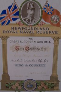 During November and December of 1913, he completed 28 days of competency test in firing the big guns, rifle and the canon tube. He received orders by Royal Proclamation on Aug. 3, 1914, and reported immediately to St. John’s for active duty.