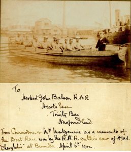 William Balsom’s family contributed to the Newfoundland Royal Naval Reserve early in its formation. The first of two brothers to enlist was Herbert in 1902. The descendants of his brother, Robert Balsom, have in their possession a postcard/photo that was given to Hebert by Commodore Montgomiere and his wife during a paddle boat race held in Bermuda among the various naval fleets that were in port during this time period. Herbert was part of a cutter’s rowing crew from the HMS Charybdis that won the event on April 6, 1902. Robert’s descendants are not exactly sure what happened to Herbert but naval records indicate his death on April 9, 1913.