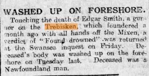 A newspaper’s article that appeared in the local paper, Southwest Weekly Post on December 21, 1918 speaks about Edgar Smith as being a gunner on Trebiskin and claims that the body of Edgar Smith washed ashore about a month later. The article reads: “deceased’s body was washed up on the foreshore on Tuesday last.” His body was recovered, identified and buried at Danygraig cemetery in the St. Thomas area of Swansea. Today his monument overlooks the docks of the area.