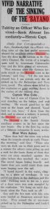 Two days after the tragedy, the Evening Telegram carried the headline “Loss of Bayano” and described how wreckage and bodies were discovered on 11th of March. The article reported that 26 survivors, 8 officers and 18 men, were rescued. A second article published by Evening Telegram on March 18Â highlighted the loss of Newfoundlanders with title “The Gallant 12” and describes how 11 Royal Naval Reservist lost their lives. Stephen Keates from Barr’d Islands, Fogo, was among the 12 sailors who survived and the paper congratulated both him and his wife on his good luck. On April 6, 1915 the Evening Telegram reported another article titled “Heroics.” The article relates the story of how survivors reported that Captain Carr and the wireless operators continued to send S.O.S messages until the ship slipped below the surface within minutes of being struck by U-27’s fatal torpedo.