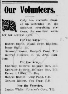 An Evening Telegram article entitled “Our Volunteers” on May 11, 1917, claimed that recruitment was slow with only ten men showing up at the different recruitment stations around the province for enlistment with the Navy, Army and Forestry. It was the smallest number for several days.