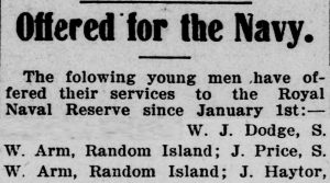 An article entitled “Offered for Service” that appeared in the Evening Telegram on January 27, 1917 confirms that he had enlisted sometime between January 1-15. Three other individuals from the Southwest Arm area were also mentioned in this article: J.T. Langdon and A. Peddle of Hodge’s Cove and J. Price of Southwest Arm.