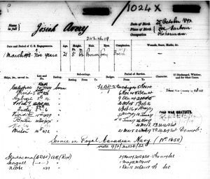 Josiah returned from furlough and was assigned to the Royal Canadian Navy. He reported to the HMCS Niobe, a shore-based structure at Halifax and was immediately assigned to a Coastal Drifter CD 68 that was attached to HMCS Stradocona for five months. On May 1, 1918 his ship was sent to HMCS Seagull, the shore-based structure at Sydney, Nova Scotia to patrol the waters around the Straits of Belle Isle. He returned home to HMS Briton around December 20, 1918 and was demobilized on March 24, 1919.