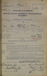 He travelled to St. John’s with his friend Joseph Bursey who would eventually become his brother-in-law. They both enlisted with the Newfoundland Royal Naval Reserve, HMS Briton and signed their application on January 9, 1918.