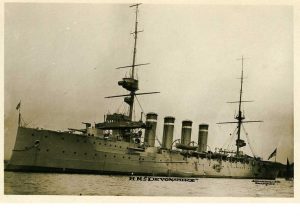 Seaman Soper trained for about six weeks and was deployed overseas in February 1918. After his arrival, he was drafted to the HMS Vivid III, a shore-based facility located at Devonport, England. The base was used for the Royal Naval Division Trawler Section. Here he completed about four months of training and was assigned to the HMS Devonshire, an Armed Merchant Cruiser. The cruiser was part of a flotilla of ships that composed the Grand Fleets of North America and West Indies Station to accompany convoys across the dangerous waters of the Atlantic.