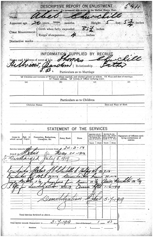 Son of James Thomas and Susanna (Cooper) Churchill Birthplace: Ivany’s Cove Birth Date: November 15, 1897 Enlistment Date: May 23, 1918 Embarkment Date: July 22, 1918 |