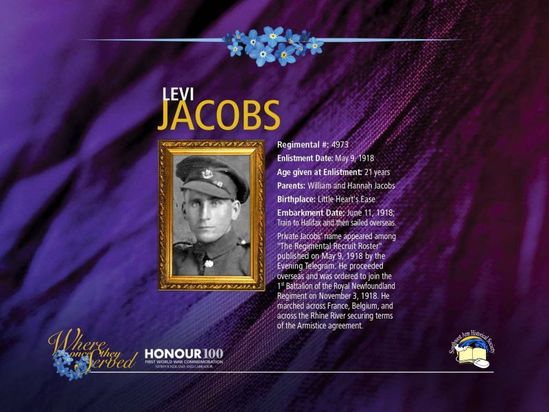 Son of William and Hannah (Spurrell) Jacobs Birthplace: Little Heart’s Ease Birth Date: March 29, 1987 Enlistment Date: May 9, 1918 Embarkment Date: July 11, 1918 |