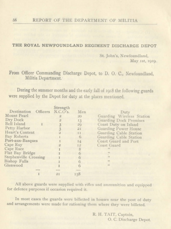 A document entitled Report of the Department of Militia: covering its work from the inauguration of the Department up to the 31st of March, 1919 ; the financial statement being to the end of the fiscal year, June 30th, 1918listed key facilities where guards were to be posted throughout Newfoundland.