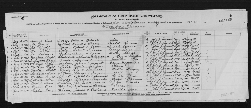 AugustĀ 2, 1890 | Ivney’s Cove | AVERY | Jabes & Rebecka | Lily | F | John J Durrant | August 25, 1890 | Methodist | not given | |
