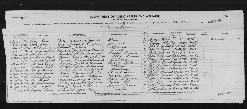 January 2, 1891 | Long Cove | PRICE | Jeremiah & Martha | Etrina | F | George King | not given | Methodist | not given | |