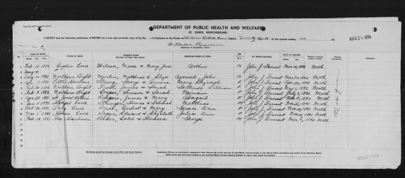November 5, 1891 | House Cove | SOPER | Edward & Elizabeth | Julia Ann | F | John J Durrant | November 21, 1891 | Methodist | not given | |