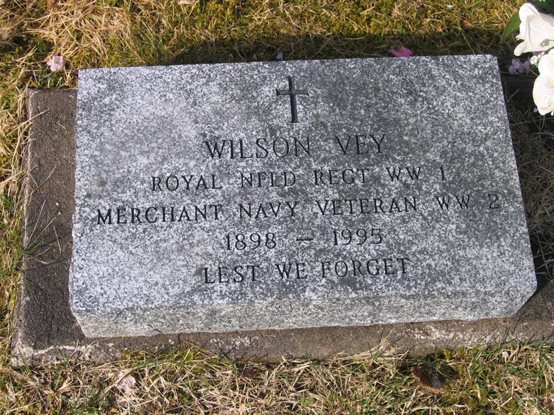 Vey Wilson 1898 1995   In loving memory of. Peace perfect peace. Until we meet again. Wilson Vey Royal Nfld Regt WW1 Merchant Navy Veteran WW2. Lest we forget.