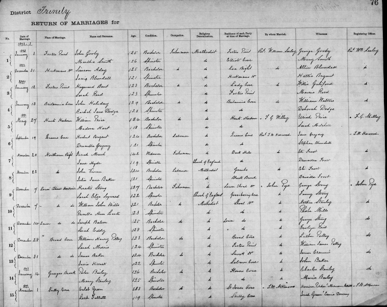 | Nov. 22, 1892 | Northern Bight | John VIVIAN | 24 | Bachelor | Labourer | Methodist | Gambo | Rev. T.H. Hardwood | Eli Frost |