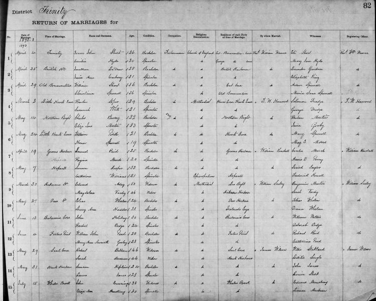 | Dec. 29, 1891 | Shoal Harbour | Thomas Pond | 28 | Bachelor | Fisherman | Episcopalian | Foster’s Point | Rev. W.H. Browning (Methodist) | Richard Reed |