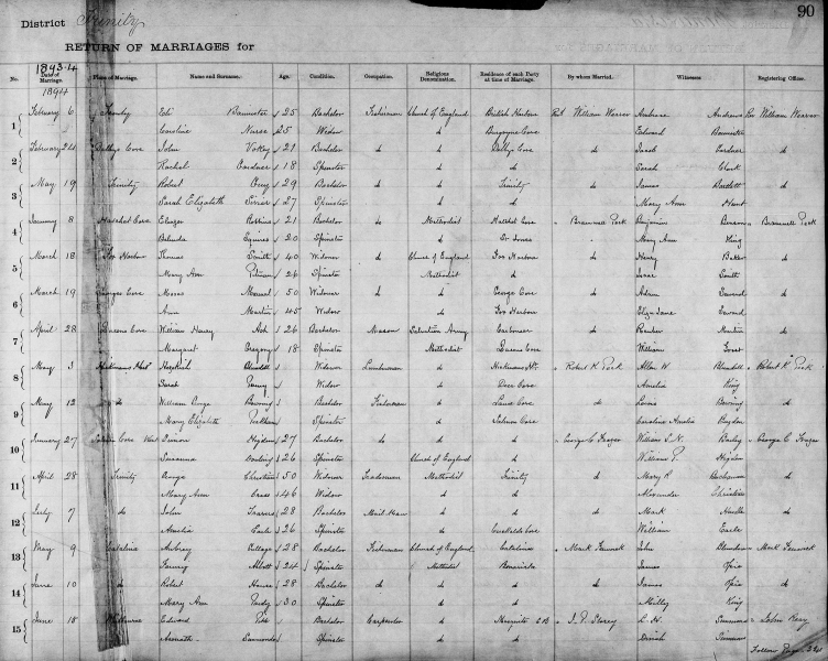 | DATE OF MARRIAGE | PLACE OF MARRIAGE | NAME AND SURNAME | AGE | CONDITION | OCCUPATION | RELIGIOUS DENOMINATION | RESIDENCE AT TIME OF MARRIAGE | BY WHOM MARRIED | WITNESSES |