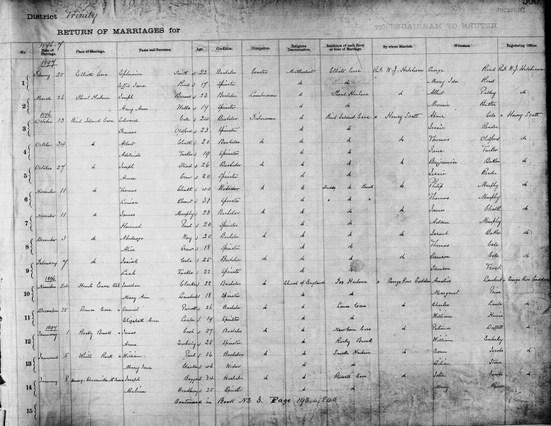 | November 8, 1894 | Little Hearts Ease | Reuben MARTIN | 26 | Widower | Fisherman | Methodist | Northern Bight | Rev. James Smith | Eliza Jane Drodge |