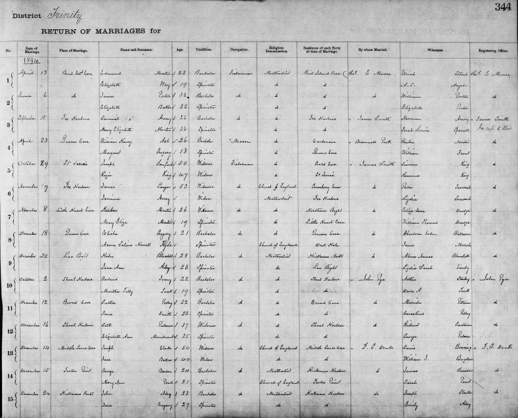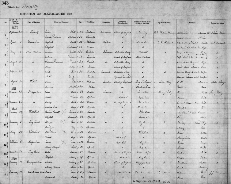 | Dec. 21, 1893 | Long Beach | David BENSON | 21 | Bachelor | Fisherman | Church of England | Northern Bight | Rev. Henry Petley | Rhoda Smith |