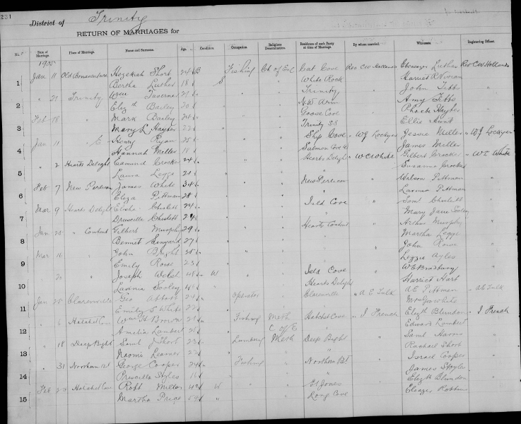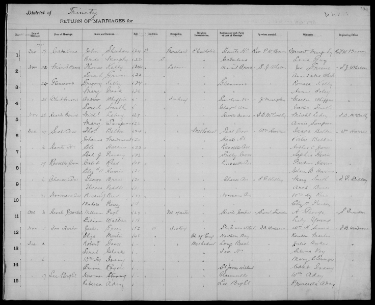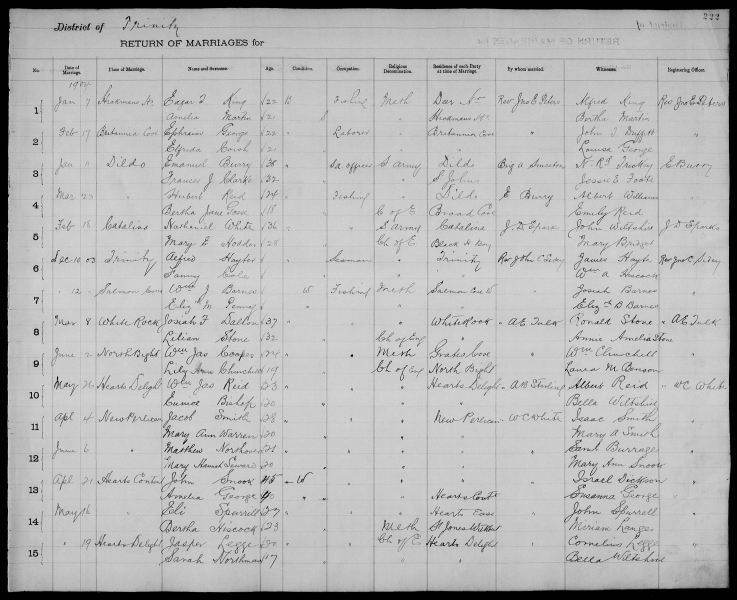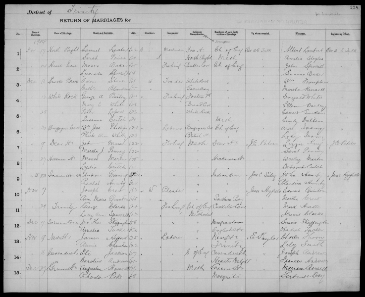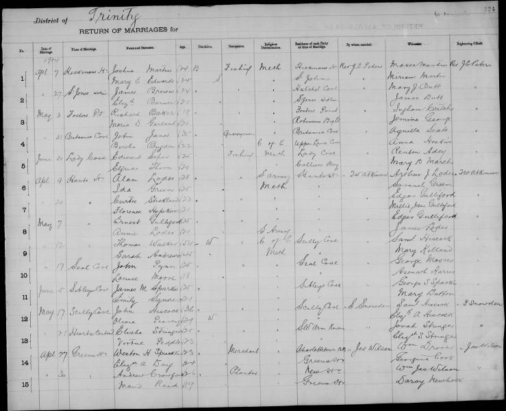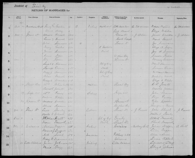 | Dec. 24, 1901 | Northern Bight | Henry Geo. MARTIN | Bachelor | Fisherman | Methodist | Little Hearts Ease | Rev. T.B. Windross | Moses Martin | |