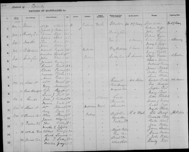 | Nov. 25, 1902 | Little Hearts Ease | Samuel PEDDLE | 20 | Bachelor | Fisherman | Methodist | Little Hearts Ease | Rev. Edwin Lewis | Geo Drodge |