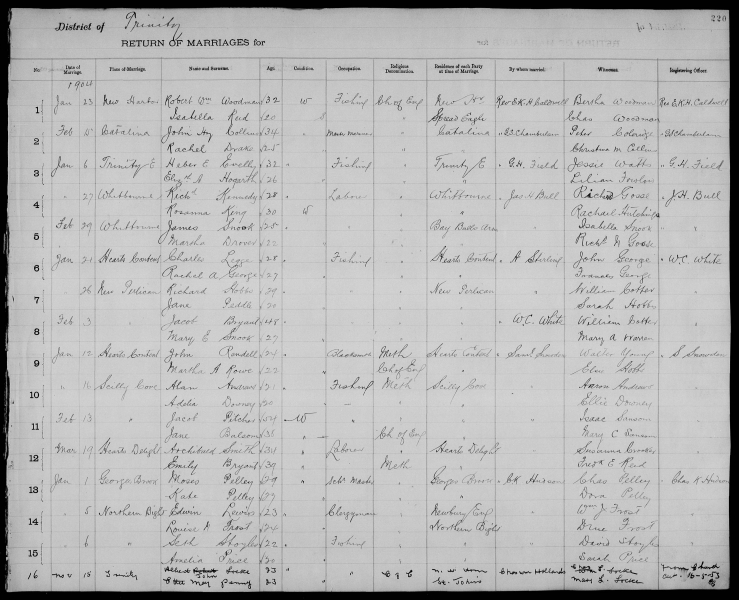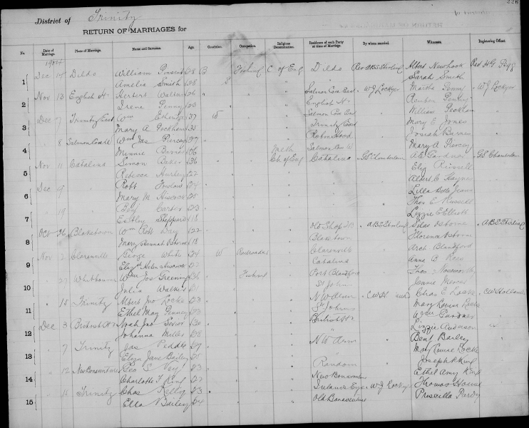 | Dec. 12, 1904 | New Bonaventure | Geo. S. VEY | 23 | Bachelor | Fisherman | Church of England | Random | Rev. C.W. Holland | Joseph King |