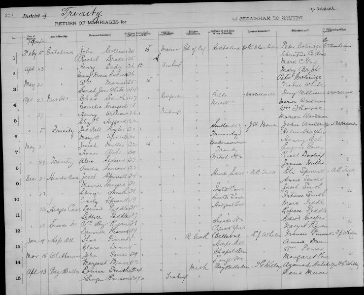 | Dec. 19, 1901 | Hodges Cove | James VEY | 28 | Bachelor | Fisherman | Church of England | Long Beach | Rev. F.C.F. Shears | Rhoda Gosse |