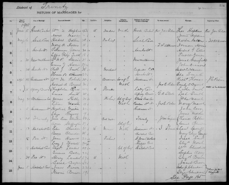 | Jan. 1, 1902 | Hodges Cove | George PEDDLE | 24 | Bachelor | Fisherman | Church of England | Hodges Cove | Rev. F.C.F. Shears | Beatrice Churchill |