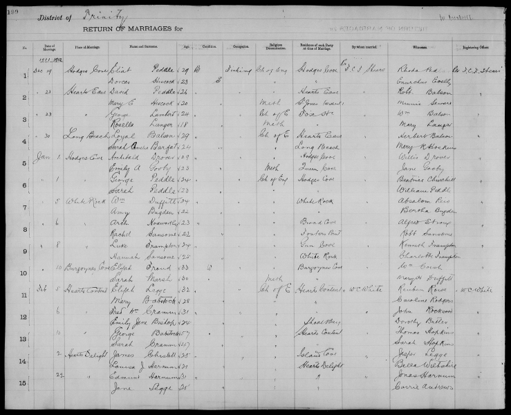 | Dec. 23, 1901 | Hearts Ease | David PEDDLE | 26 | Bachelor | Fisherman | Church of England | Hearts Ease | Rev. F.C.F. Shears | Robt. Balson |