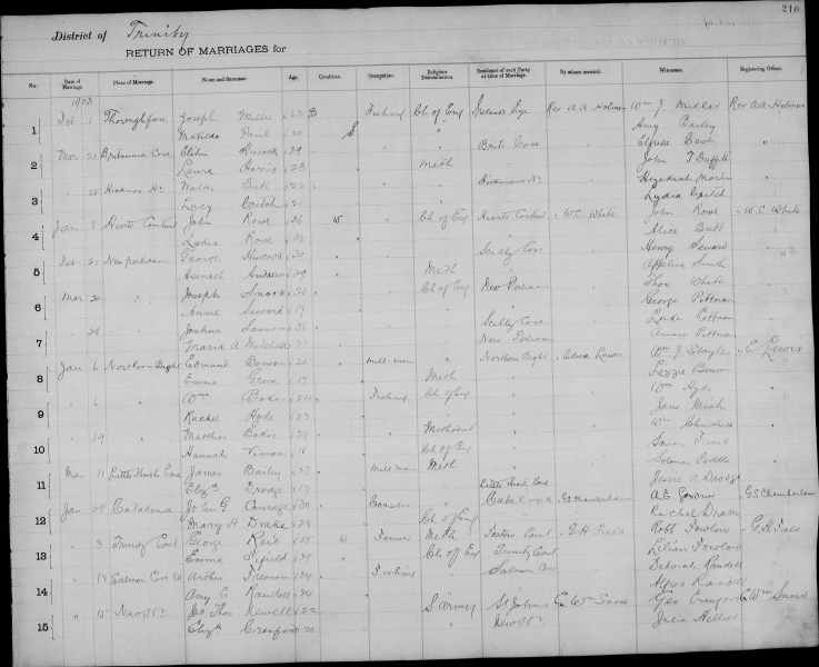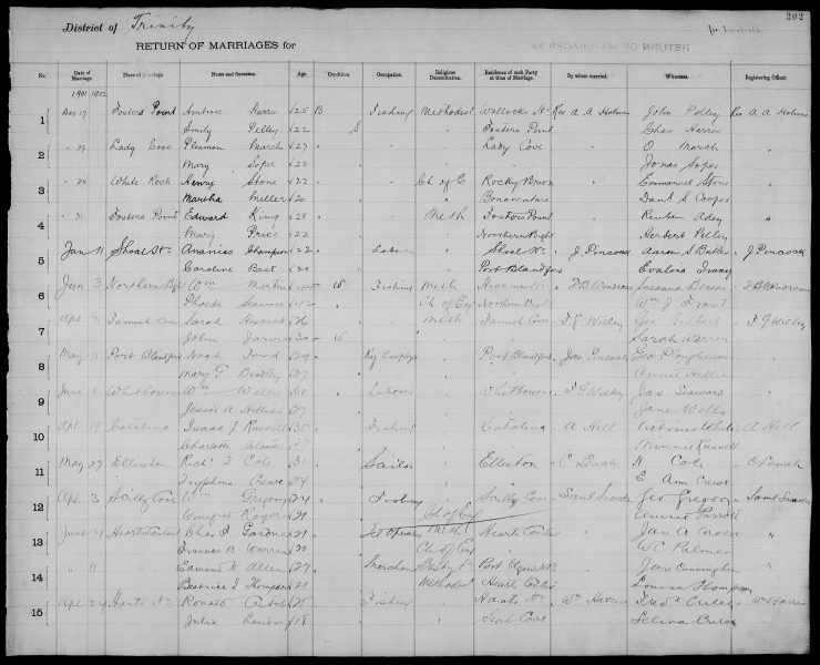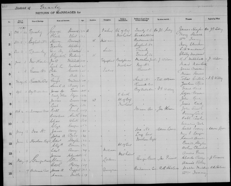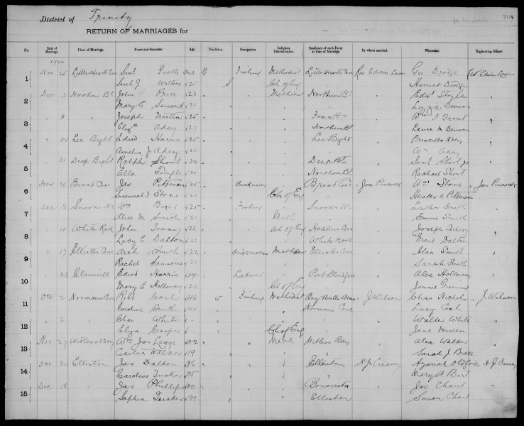 | Dec. 11, 1902 | Northern Bight | Joseph MARTIN | 25 | Bachelor | Fisherman | Methodist | Fox Harbour | Rev. Edwin Lewis | Wm. F. Frost |