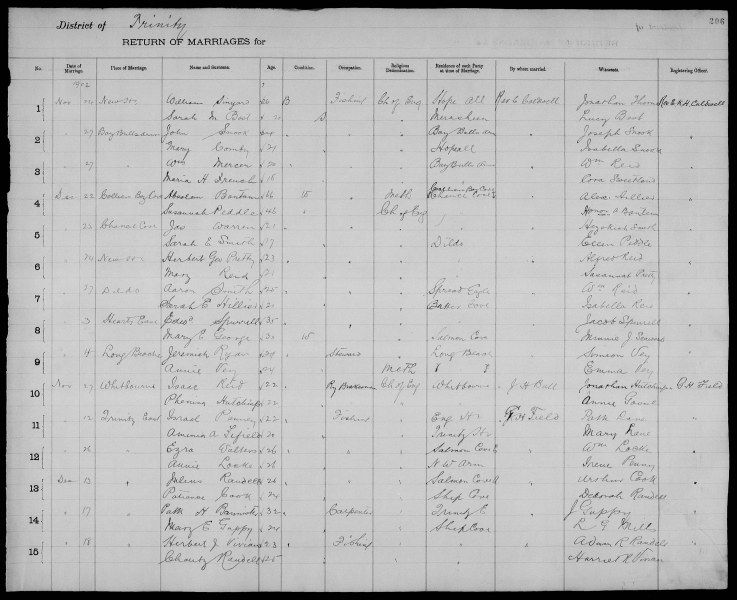 | Dec. 4, 1902 | Long Beach | Jeremiah RYAN | 29 | Bachelor | Steward | Church of England | Salmon Cove | Rev. E. Caldwell | Simeon Vey |