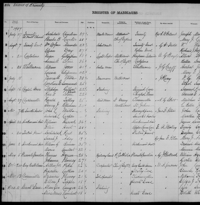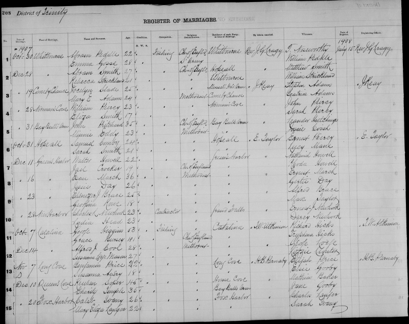 | Dec. 11, 1907 | Hearts Ease | Alan George LANGER | 26 | Bachelor | Fishing | Church of England | Hearts Ease | M.K. Gardner | Levi Smith |