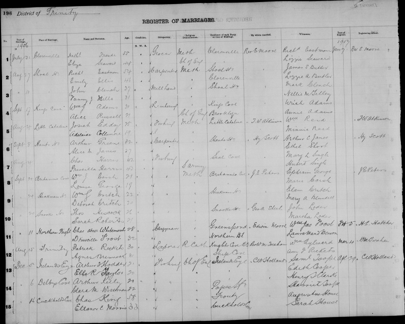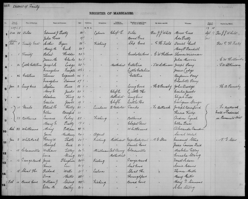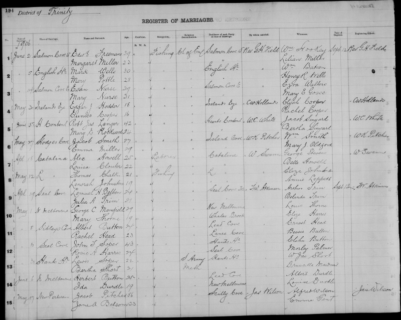 | Sept. 11, 1906 | Northern Bight | Charles Abner WHITEMARSH | 28 | Bachelor | Clergyman | Methodist | Greenspond | Edwin Moore | William James Frost |