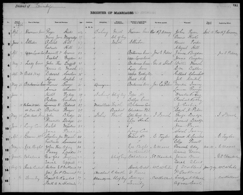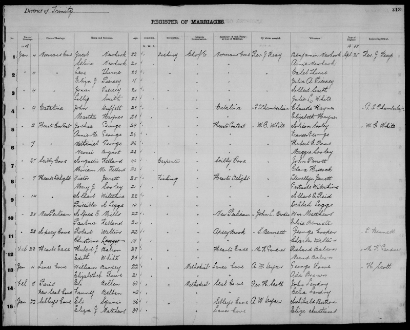 | Dec. 25, 1905 | Little Hearts Ease | John PEDDLE | 20 | Bachelor | Fishing | Methodist | Little Hearts Ease | Isaac French | George Norris |