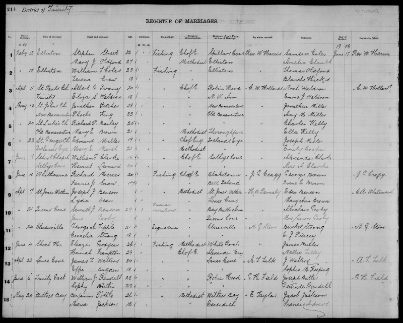 | July 21, 1908 | St. Jones Within | George JACOBS | 29 | Widower | Fishing | Methodist | Little Hearts Ease | W.P. Scarth | John Dodge |