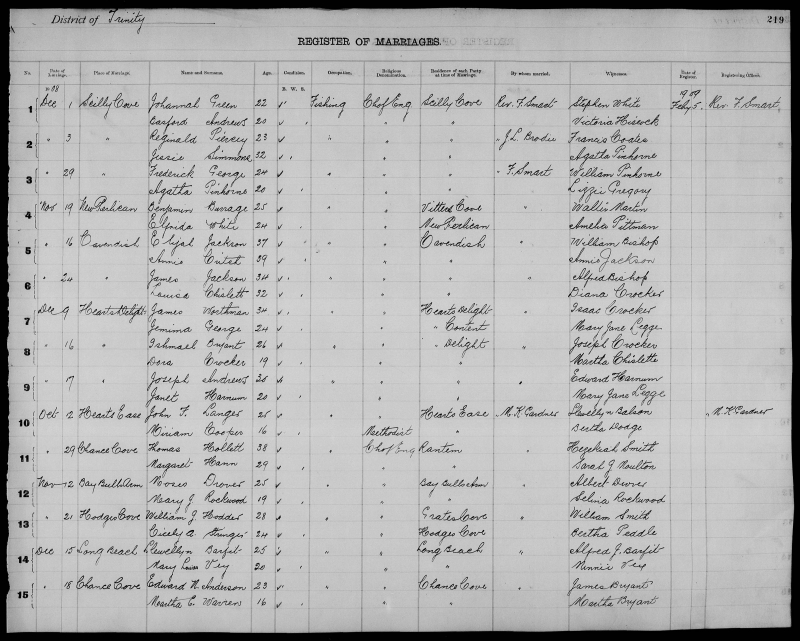 | Dec. 3, 1906 | Hodges Cove | John DODGE | 25 | Bachelor | Fishing | Church of England | Little Hearts Ease | M.K. Gardner | George Jacobs |