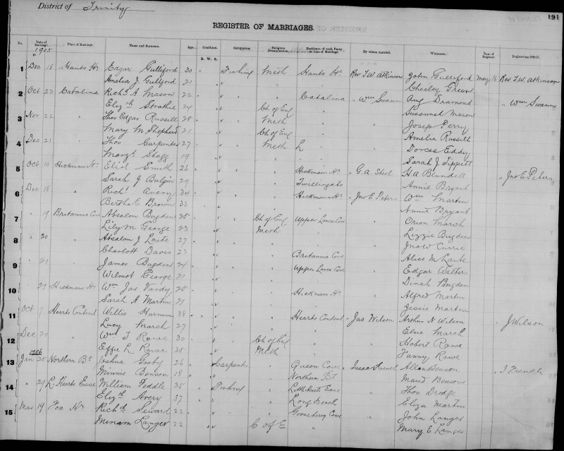 | Feb. 12, 1907 | Long Beach | William Thomas DRODGE | 32 | Bachelor | Mechanic | Methodist | Little Hearts Ease | H.G. Hatcher | Jacob Drodge |