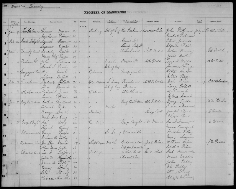 | Jan. 25, 1906 | Northern Bight | Joshua GOOBY | 26 | Bachelor | Carpenter | Methodist | Queens Cove | Isaac French | Allan Benson |