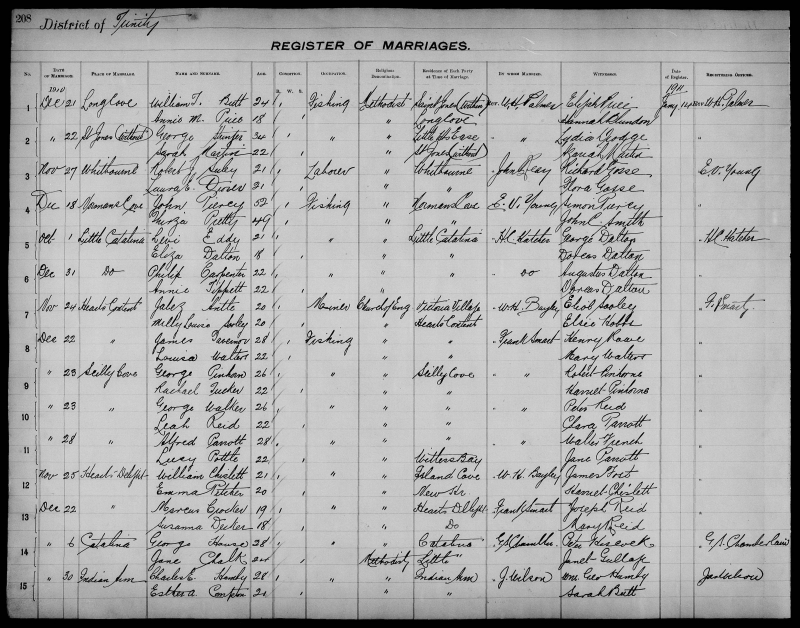 | Dec. 21, 1910 | Long Cove | William T. BUTT | 24 | Bachelor | Fishing | Methodist | St. Jones Within | W.H. Palmer | Elijah Price |