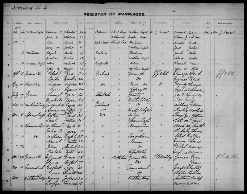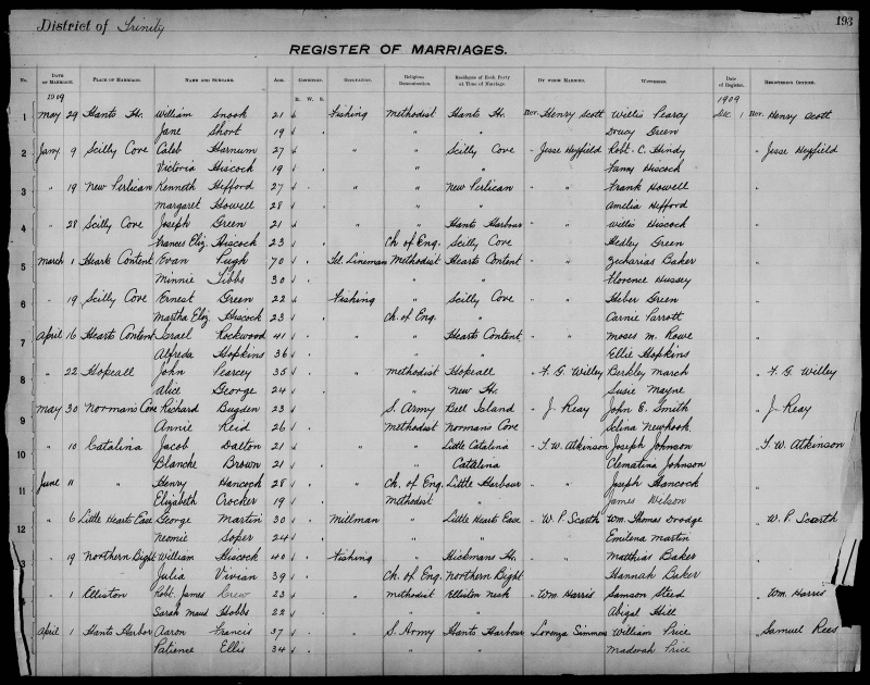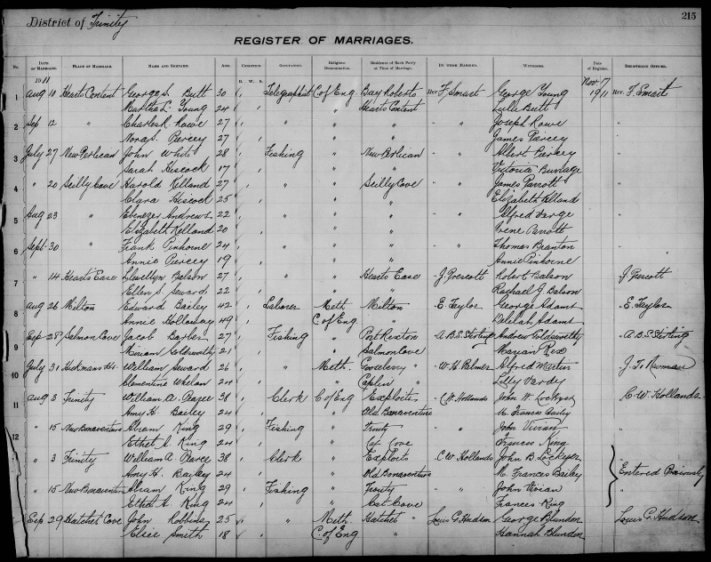 | Nov. 10, 1909 | Queen’s Cove | Herbert J. CRAMM | 23 | Bachelor | Fishing | Methodist | Hatchet Cove | W. P. Scarth | James Churchill |