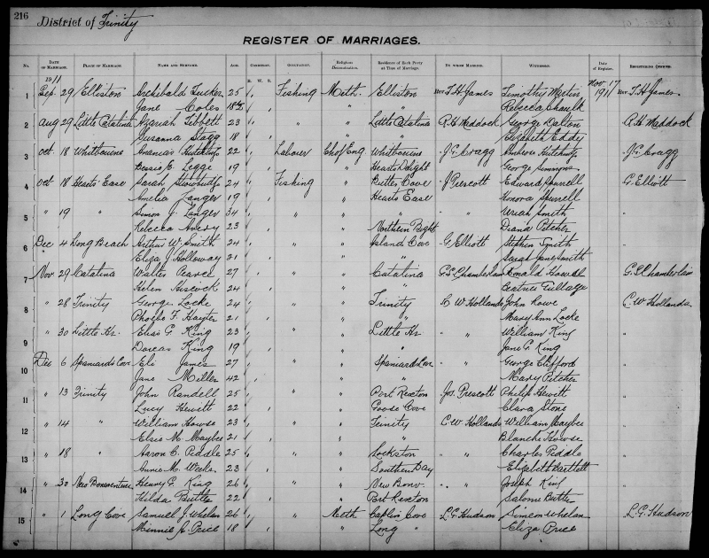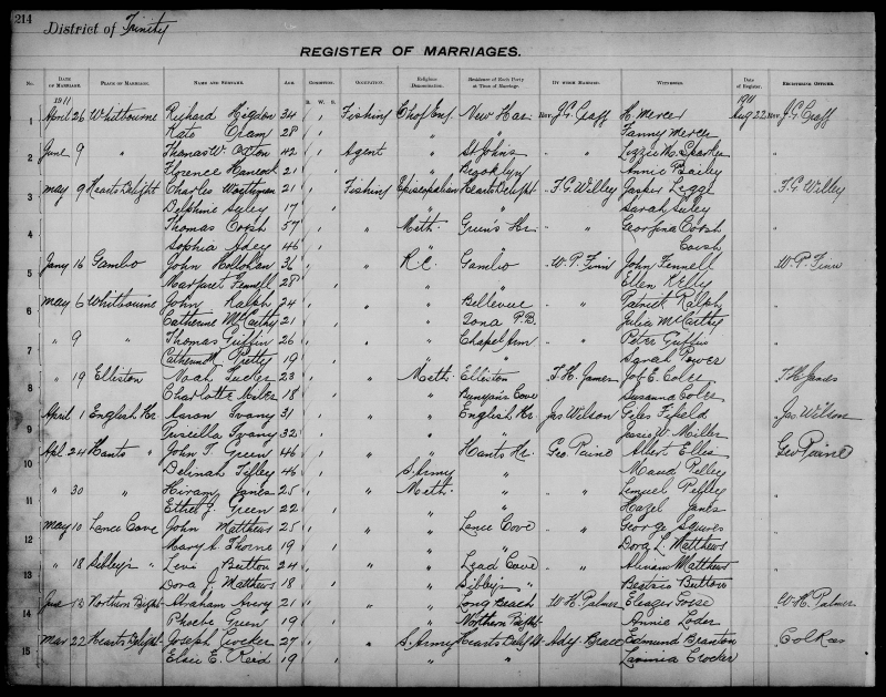 | Oct. 19, 1911 | Hearts Ease | Simon J. LANGER | 34 | Bachelor | Fishing | Church of England | Hearts Ease | J. Prescott | Uriah Smith |