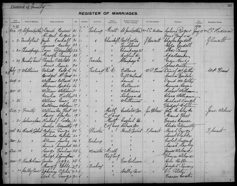 | Nov. 14, 1912 | St. Jones Without | Luther GEORGE | 25 | Widower | Fishing | Church of England | Scilly Cove | L.G. Hudson | Louis Green |