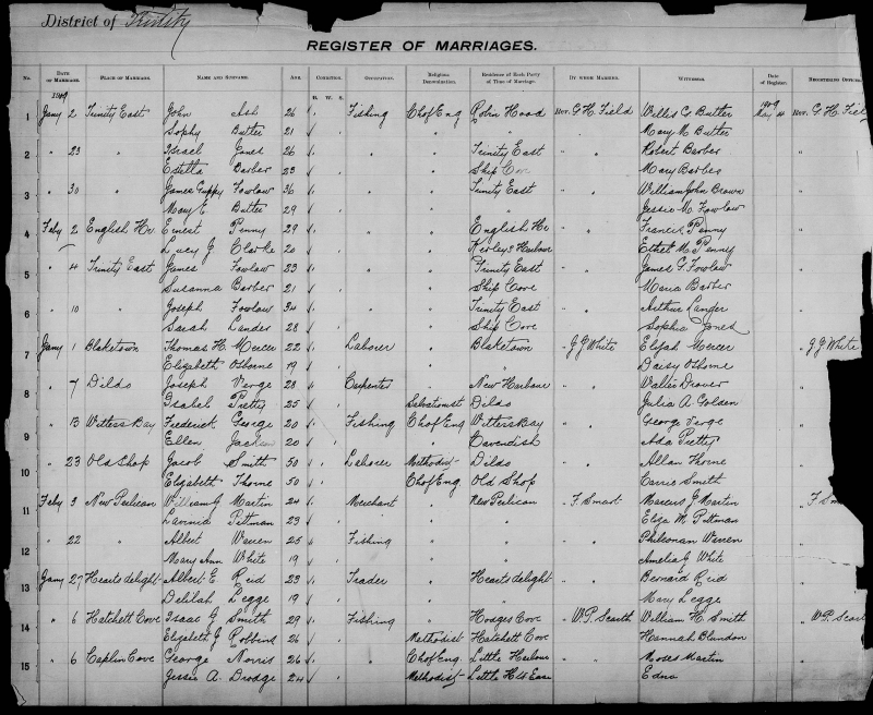 | Jan. 9, 1911 | Long Cove | William MARTIN | 24 | Bachelor | Fishing | Methodist | Caplin Cove | W. H. Paler | Silas Tucker |